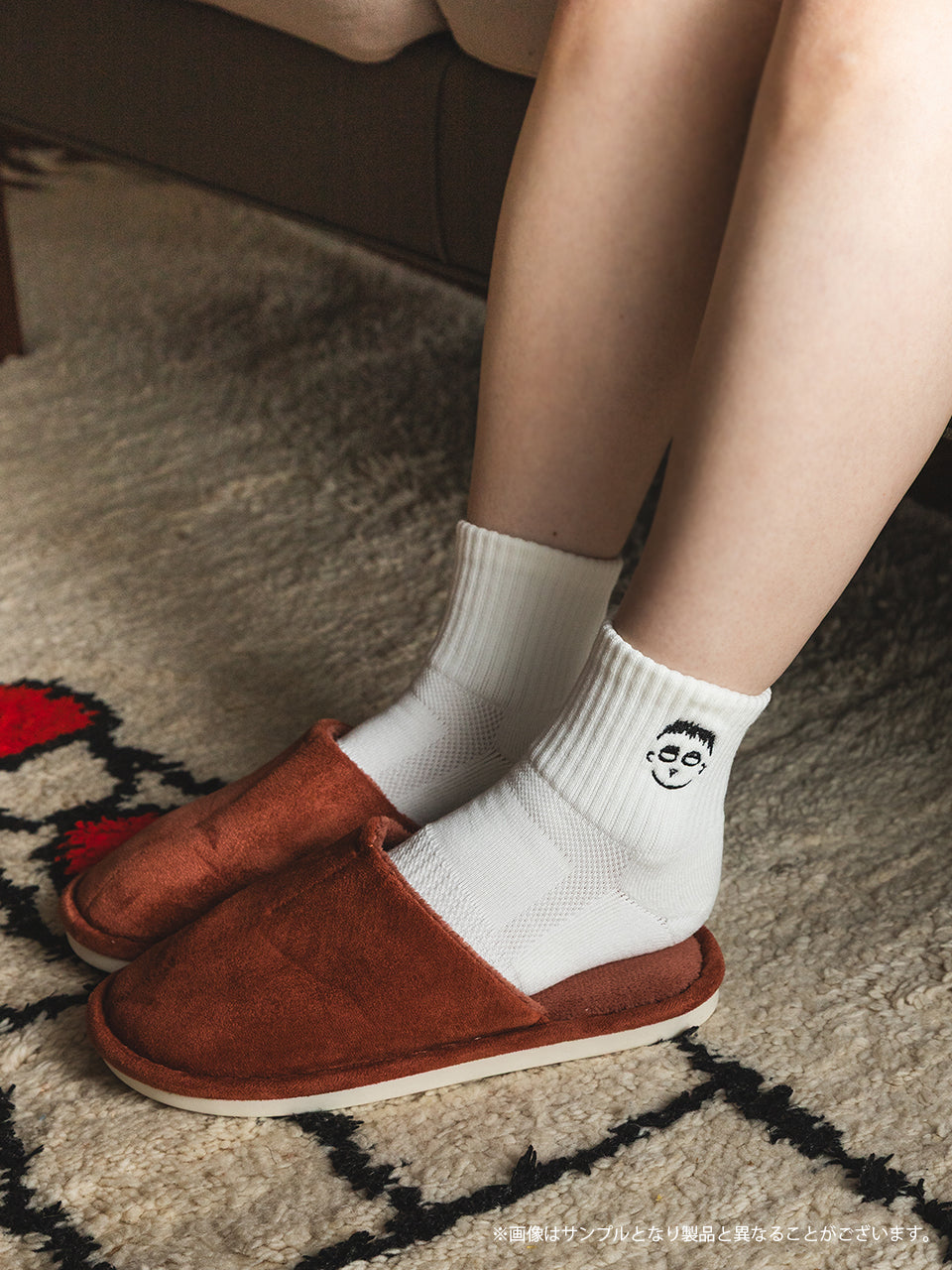 シンプルな中にひねりが効いたデザインは、普段使いできるさりげないアイテムで、日常の中に番組のユーモアを忍ばせたような一足です。